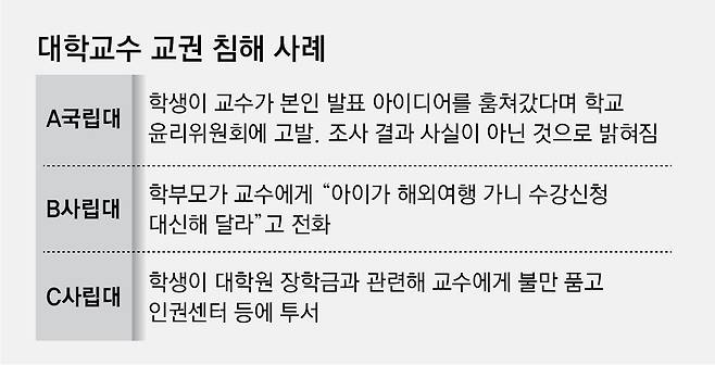수도권 사립대 D 교수는 “(교권 침해) 사각지대에 놓여 있던 교수들이 ‘당할 수만은 없다’는 생각에 교수 노조에 가입하거나 노조에 신고하는 움직임이 늘고 있다”고 말했다.