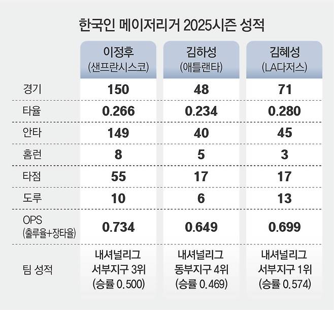 이정후(27·샌프란시스코), 김하성(29·애틀랜타), 김혜성(26·LA 다저스) 등 코리안 메이저리거 삼총사가 절반의 아쉬움과 절반의 기대로 미국프로야구 메이저리그(MLB) 2025 정규시즌을 마무리했다.