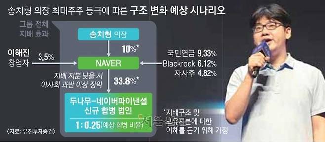 조 연구원은 “합병 네이버파이낸셜 출범 이후 이 의장이 송 회장과 지분 교환을 통해 네이버 경영권을 넘길 수 있다”고 분석했다. 김소혜 한화투자증권 연구원도 “네이버와 두나무 간의 빅딜이 예정대로 진행된다면 이 의장이 지배주주와 경영자로서의 지위를 송 회장에게 모두 넘기는 그림이 될 것”이라고 했다. 네이버는 국민연금(9.3%), 블랙록(6%), 이 의장(3%대) 등으로 지분이 분산돼 있어 지배주주가 없는 구조다.