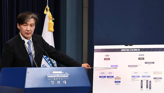 | ▲ 조국 청와대 민정수석이 14일 오후 춘추관 대브리핑실에서 현 정부의 국정원, 검찰, 경찰 등 권력기관 개혁 방안을 발표 하고 있다. 2018.1.14 |