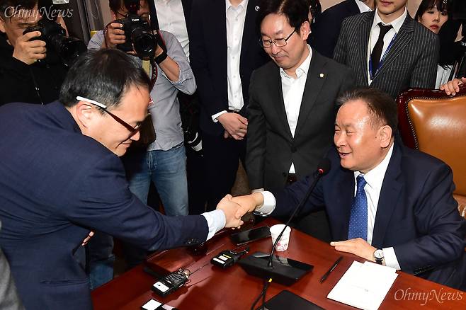 | ▲ 박주민과 악수하는 이상민 위원장 이상민 사법개혁특별위원회(사개특위) 위원장이 2019년 4월 29일 오후 국회 문화체육관광위원회 회의실에서 열린 전체회의에서 고위공직자범죄수사처(공수처) 법안과 검경 수사권 조정안 등 법안을 패스트트랙(신속처리안건)으로 지정한 후 박주민 의원과 악수를 나누고 있다. |