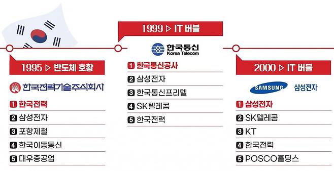 1990년대 한국 증시는 공기업의 독무대였다. 1988년 포스코가 상장하고 1989년 한국전력이 재상장하면서 증시의 중심은 증권주에서 전자와 통신으로 이동했다. 1994년 한전의 시가총액은 무려 16조5000억원에 달해 2위 포스코의 세 배 가까이 됐다. “증시의 제왕은 삼성전자가 아니라 한전”이란 말이 어색하지 않았던 시절이다.