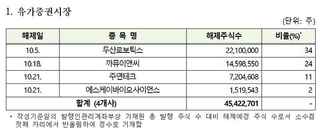 시장별로는 유가증권시장 4개사에서 총 4542만주가 코스닥시장 48개사에서 총 1억8640만주가 해제된다.
