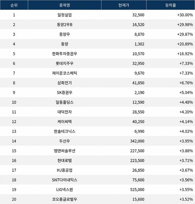 6위 롯데지주우(00499K)는 현재가 32,950원으로 7.33% 상승 중이다. 7위 제이준코스메틱(025620)은 현재가 9,670원으로 7.33% 상승 중이다. 8위 삼화전기(009470)는 현재가 41,850원으로 6.76% 상승 중이다. 9위 SK증권우(001515)는 현재가 2,190원으로 5.04% 상승 중이다. 10위 일동홀딩스(000230)는 현재가 12,590원으로 4.48% 상승 중이다.