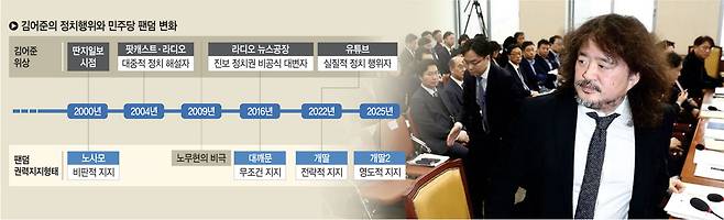 이 같은 김어준의 정치 행로는 과거 민주당 정권에 대한 ‘비판적 지지’를 고수했던 팬클럽 ‘노사모’가 주군의 비극적 죽음 이후 ‘노빠’로, ‘대깨문’으로, 다시 ‘개딸’로 진화하면서 비타협적 정치운동의 전선에 서게 된 것과 궤를 같이한다. 그 모든 구비에 김어준이 있었다. 어느 순간 민주당 정치인들은 ‘당원의 비위를 맞추지 않으면 생존할 수 없다’는 생각에 사로잡혔다.