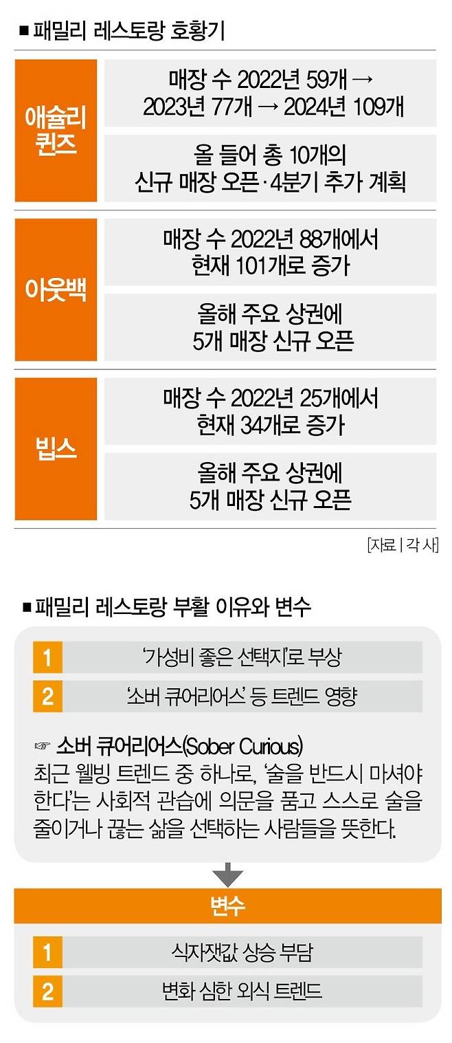 패밀리 레스토랑의 인기를 떠받치는 소비 트렌드가 얼마나 지속할 수 있을지도 알 수 없다. 몇몇 외식 전문가는 최근 주목받는 소버 큐어리어스나 점심 회식 문화가 일시적인 흐름일 수 있다고 꼬집는다. 2010년대 중반 외식 트렌드를 바꿔놓은 혼밥·혼술 문화가 수그러든 전철前轍을 밟을 것이란 얘기다.
