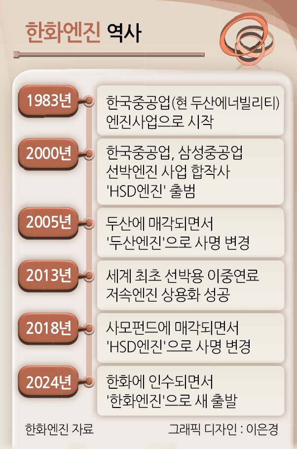 한화엔진은 최근 무서운 상승세를 달리고 있지만, 그 어떤 회사보다 많은 우여곡절을 겪었다. 대내외 불확실성을 이유로 모회사가 수시로 바뀌면서 사명 변경이 잦았다. 출발은 1983년 한국중공업(현 두산에너빌리티) 내 설립된 선박엔진 사업부이다. 이후 IMF(국제통화기금) 외환위기 사태 때 정부 주도의 산업 빅딜이 이뤄지는 과정에서 한국중공업과 삼성중공업의 선박엔진 사업 간 합작계약 체결이 이뤄지면서 HSD엔진이 탄생했다.