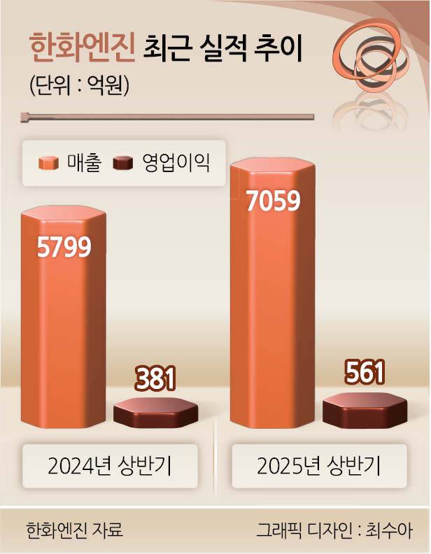 한화엔진의 올해 상반기 매출액과 영업이익은 각각 7059억원, 561억원이다. 지난해 같은 기간(매출 5799억원, 영업이익 381억원)보다 각각 21.7%, 47.2% 증가했다.