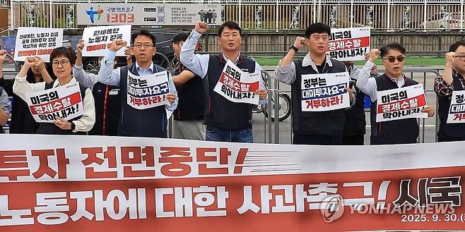 (서울=연합뉴스) 최재구 기자 = 양경수 위원장을 비롯한 전국민주노동조합총연맹 회원들이 30일 서울 용산 대통령실 앞에서 '대미투자 전면중단! 구금 노동자에 대한 사과촉구!' 시국 기자회견을 열고 구호를 외치고 있다. 2025.9.30
