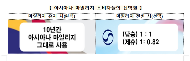 소비자가 아시아나 마일리지를 대한항공 마일리지로 전환할 경우 탑승 마일리지 1 대 1, 제휴 마일리지 1 대 0.82 (대한항공-아시아나)의 비율이 적용됩니다.