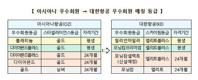 합병 이후에는 아시아나의 5개 각 회원등급에 상응하는 대한항공의 회원등급이 부여됩니다.