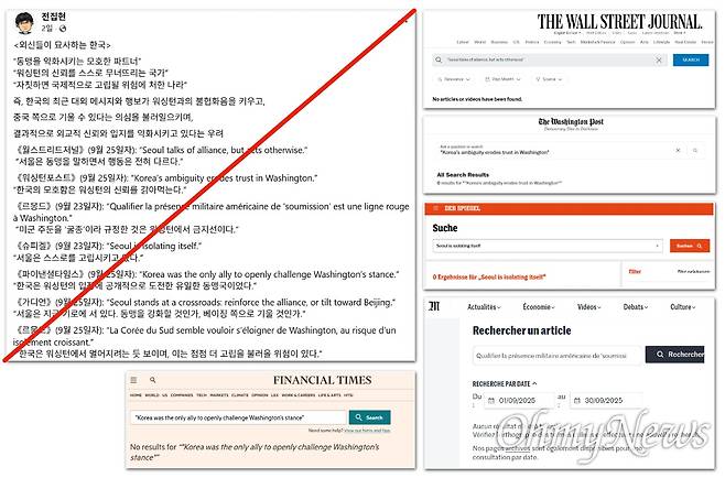 해당 글을 쓴 전집현 작가는 같은 날 자신의 페이스북에도 <외신들이 묘사하는 한국> 이란 제목으로 최근 주요 외신이 한미관계와 이재명 정부를 "동맹을 약화시키는 모호한 파트너", "워싱턴의 신뢰를 스스로 무너뜨리는 국가", "자칫하면 국제적으로 고립될 위험에 처한 나라"로 보도했다고 주장하며 외신 기사 제목을 열거했다. 외신들이>