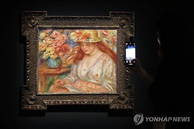 (과천=연합뉴스) 강민지 기자 = 30일 경기 국립현대미술관 과천에서 열린 MMCA 해외 명작 '수련과 샹들리에' 언론공개회에 참석자가 피에르 오귀스트 르누아르의 '노란 모자에 빨간 치마를 입은 앙드레(독서)'를 둘러보고 있다. 2025.9.30