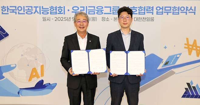[임종룡 우리금융그룹 회장(왼쪽)과 김현철 한국인공지능협회장이 지난 29일 우리금융 본사에서 업무협약을 체결하고 기념 촬영을 하고 있다. (자료=우리금융그룹)]