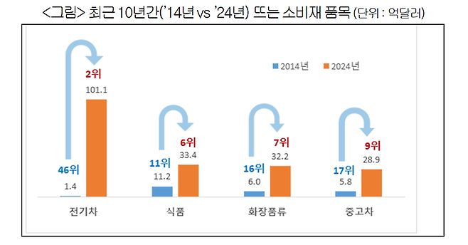 가장 눈에 띄는 변화는 전기차의 부상이다. 전기차 수출액은 2014년 1억 4000만 달러에서 2024년 101억 1000만 달러로 약 70배 폭증하며 단숨에 수출 2위 품목으로 뛰어올랐다. 같은 기간 K-뷰티와 K-푸드 열풍을 이끈 화장품류와 식품 수출액도 각각 5배, 3배 성장하며 10대 수출 품목에 새롭게 이름을 올렸다. 중고차 역시 5배 성장하며 10위권에 신규 진입했다.