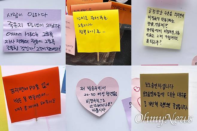 | ▲ 서울 상암동 MBC 앞 기상캐스터 고 오요안나 분향소 앞에 붙은 시민들의 응원 메시지 중 일부. |