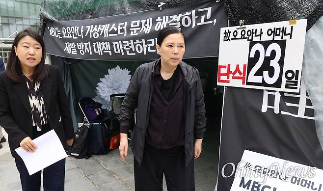 | ▲ 직장 내 괴롭힘을 호소하다 숨진 기상캐스터 고 오요안나씨의 어머니 장연미씨가 30일 오전 서울 마포구 상암동 MBC 사옥 앞 분향소에서 딸의 명예 회복을 위한 공개 사과와 기상캐스터 정규직 전환, 정당한 보상 및 재발 방지 대책 마련 등을 요구하며 23일째 단식농성을 벌이고 있다. |