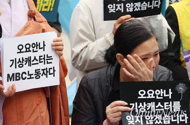 | ▲ 고 오요안나씨의 어머니 장연미씨가 30일 오전 서울 마포구 상암동 MBC 사옥 앞에서 열린 기자회견에 참석해 MBC의 무책임한 태도에 눈물을 흘리고 있다. |