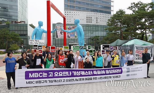 30일 오전 11시 서울 상암동 MBC 앞에 세워진 고 오요안나씨의 분향소 앞에서 열린 기자회견에서 이들은 MBC에 책임 있는 답변을 요구했다. 이들은 "오씨의 사망이 비정규직 프리랜서이기에 겪은 구조적 괴롭힘의 성격이 있기 때문에, 기상캐스터를 정규직으로 전환해 비슷한 죽음이 반복되지 않도록 해야 고인의 뜻을 잇는 것"이라고 강조했다.