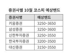 키움증권이 10월 코스피 예상밴드로 3250~3650, 삼성증권은 3250~3600을 각각 전망했다. 신한투자증권은 3250~3550, 한국투자증권은 3200~3500을 예상했고 대신증권은 3150~3550을 내다봤다.
