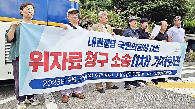 | ▲ 직접민주주의연대가 29일 오전 10시 서울중앙지법에서 기자회견을 열고 국민의힘을 피고로 1인당 10만 원씩 '내란 위자료'를 청구하는 소송에 나선다고 밝혔다. |