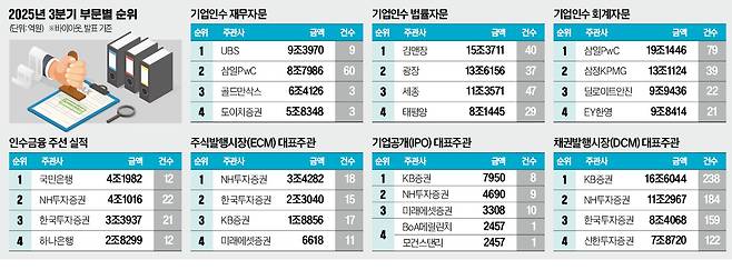 M&A 전략을 총괄하고 딜을 주도하는 재무자문 부문에서는 UBS가 1위를 차지했다. UBS는 올 1분기부터 3분기까지 세 분기 연속 1위를 놓치지 않았다. SK이노베이션의 LNG발전 자회사 2곳의 지분을 유동화하는 3조원짜리 거래에서 SK 측에 재무자문을 제공하는 등 9건, 9조3970억원 규모의 거래를 자문했다.