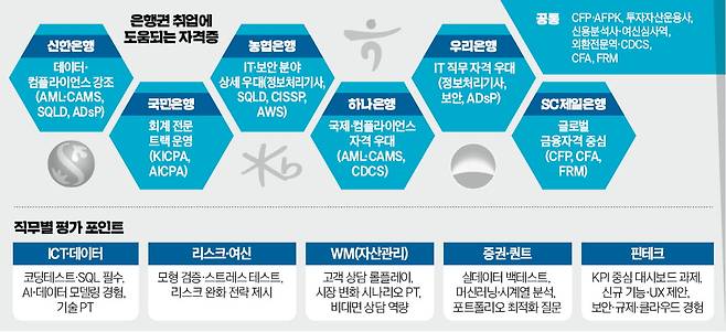 ICT·데이터 직군은 코딩 능력이 필수다. 파이썬, SQL(데이터베이스 관리 언어), 머신러닝(데이터 기반 예측 기술)은 사실상 기본 요건이다. 하나은행은 알고리즘·SQL 코딩 테스트를 의무화했고, 일부 은행은 AI 모델링 경험이나 기술 프레젠테이션까지 요구한다.