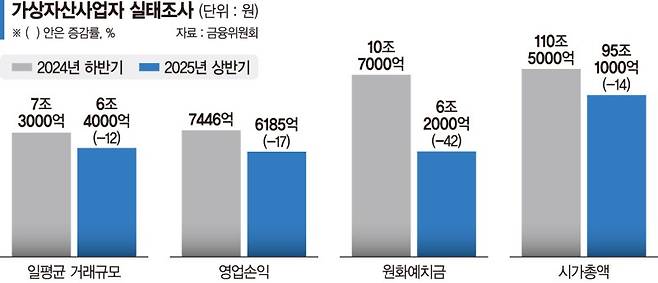 조사 결과 가상자산 거래업자의 일평균 거래규모는 6조4000억원으로 지난해 하반기 대비 12% 감소했다.