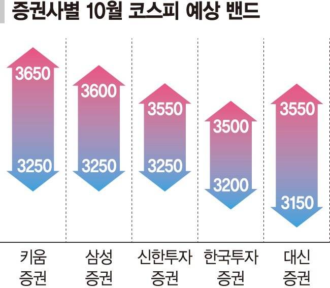 키움증권이 10월 코스피 예상밴드로 3250~3650, 삼성증권은 3250~3600을 각각 전망했다. 신한투자증권은 3250~3550, 한국투자증권은 3200~3500을 예상했고 대신증권은 3150~3550을 내다봤다.