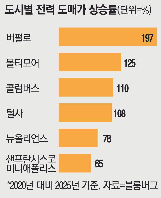 인공지능(AI) 붐으로 데이터센터가 급격히 늘어나면서 미국 전역의 전력 도매가격이 치솟고 있다.