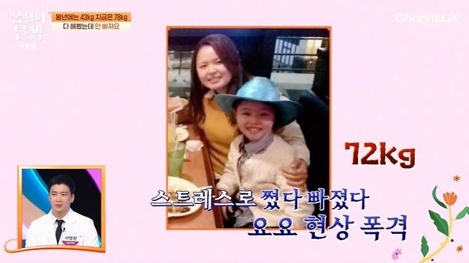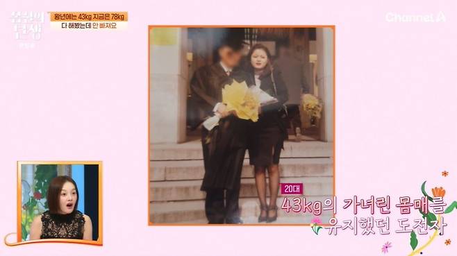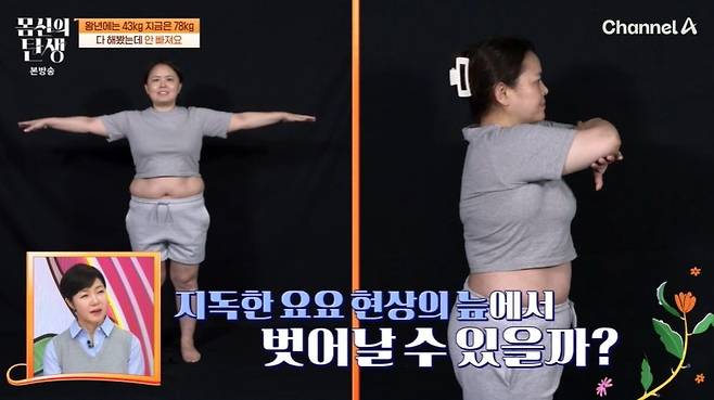 도전자는 "20대엔 43kg 정도였는데, 출산 직후 78kg까지 나갔다. 한약, 양약 먹고 이것저것 다 해서 60kg 초반까지 감량했다. (살이) 빠졌던 것도 생각 못하고, 회식 있으면 폭식하고 그러니까 또 살이 찌더라. 그게 계속 반복된다"라고 토로했다.