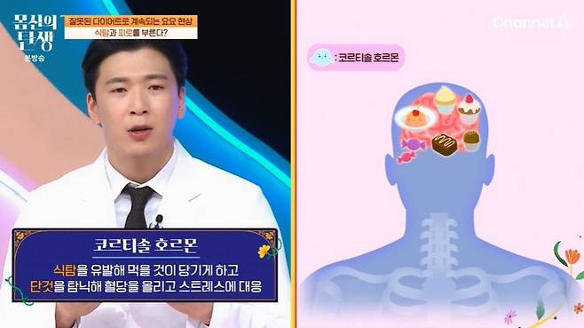 다이어트 후 쭉 유지한 적은 없다는 도전자. 이에 유민상은 "요요 현상이 흡연같은 존재다. 영원히 끊는 게 없다고 하지 않냐. 참는 거지. 다시 (음식을) 입에 대는 순간 또 다시 찌는 거다"라고 밝혔다. 전문의는 "극심한 다이어트로 우리 몸이 스트레스를 받으면, 코르티솔 호르몬이 나온다. 체내 코리티솔 농도가 증가하면 복부 지방을 더 잘 축적시키는 환경이 된다"라고 설명했다.