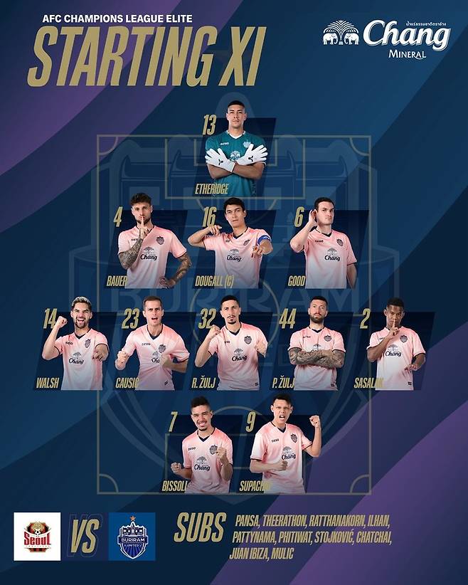 이에 맞선 부리람은 사살락 하이프라콘과 로베르트 바우어, 커티스 굿, 길례르미 비솔리, 수파차이 차이디드, 샌디 월시, 케네스 두갈, 고날 차우시치, 로버트 줄, 페테르 줄리, 골키퍼 닐 에더리지가 선발 출격했다.
