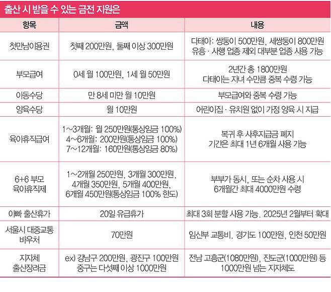 대표적으로 출산 직후 지급하는 바우처 ‘첫만남이용권’ 액수가 늘었다. 과거에는 출생아 1명당 200만원이 일률 지급됐지만, 지난해부터는 첫째 200만원, 둘째 이상은 300만원으로 차등 지원된다. 쌍둥이는 한 번에 500만원, 세쌍둥이는 800만원을 받는 셈이다. 유흥업소나 사행 업종을 제외한 거의 모든 업종에서 사용할 수 있다.