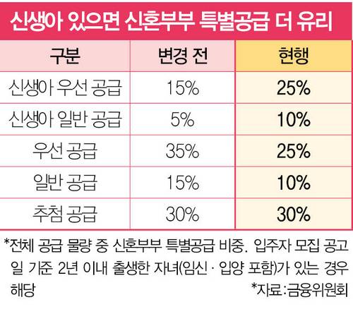 신생아가 있는 가구는 청약 당첨 기회가 더 높아졌다. 입주자 모집 공고일을 기준으로 2년 내 태어난 자녀(임신·입양 포함)가 있으면 지원할 수 있는 신생아 우선 공급 물량은 15% → 25%, 신생아 일반 공급 물량은 5% → 10%로 늘어났다. 대신, 국민주택이나 공공주택의 신혼부부 특별공급 물량은 그대로에 국민주택은 30%, 공공주택은 10~15% 내에 물량을 배정한다.