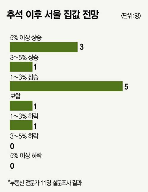 매경이코노미가 부동산 전문가 11명을 대상으로 설문조사한 결과, 10명이 “추석 이후에도 서울 주택 가격이 상승세를 이어갈 것”이라고 전망했다. 이 중 5명은 “연말까지 집값이 1~3%가량 오를 것”이라고 내다봤다. “집값이 5% 이상 오를 것”이라고 응답한 전문가도 3명이나 있었다.