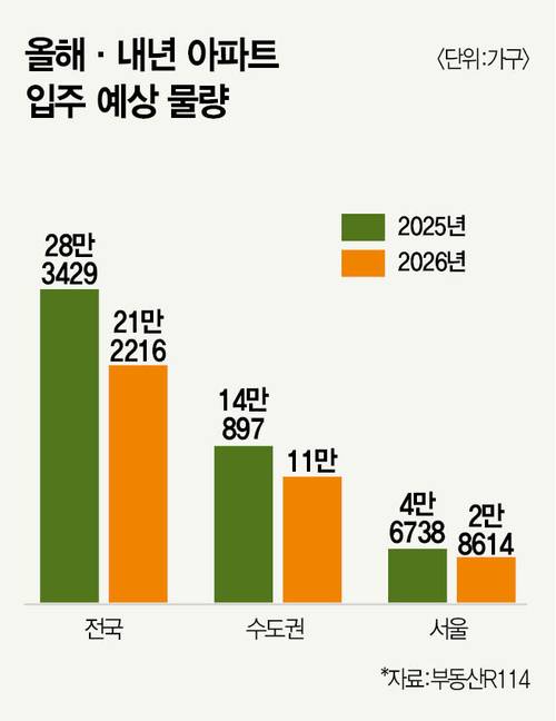 내년 이후 사정은 더 심각하다. 부동산R114에 따르면, 서울 아파트 입주 물량은 올해 4만6738가구에서 내년 2만8614가구로 40%가량 줄어든다. 2027년에는 8516가구로 쪼그라들어 1만가구에도 못 미친다.