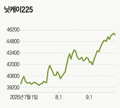 일본 대표 주가지수 닛케이225는 지난 4월 한 차례 급락한 이후 줄곧 오름세를 보였다. 지난 4월 7일 도널드 트럼프 미국 대통령이 일방적인 상호관세를 발표하며 닛케이225는 하루에만 지수가 8% 급락했다. 그러나 금세 회복하며 9월 들어서는 연일 신고가를 갈아치우고 있다. 닛케이225는 9월 24일 4만5630포인트로 거래를 마감하며 종가 기준 사상 최고치를 경신했다. 지난 4월 저점과 비교하면 무려 48% 높은 수치다.