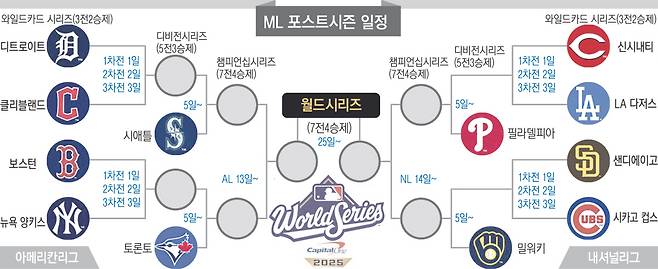 와일드카드 시리즈는 상위 시드 팀에 홈 어드밴티지가 주어지며 휴식 없이 3연전으로 치러진다. 이어지는 디비전시리즈는 5일 시작된다. 챔피언십 시리즈와 월드시리즈는 7전4승제로 승부를 가린다.