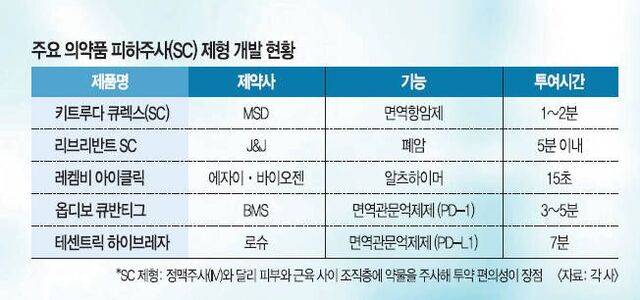 SC 제형 변화는 글로벌 제약사들의 주요 전략으로 자리 잡고 있다. 오기환 한국바이오협회 전무는 “오리지널 제약사 입장에서는 특허 만료를 앞두고 SC 제형 같은 개량 신약을 내놓는 것이 후발주자의 도전을 방어하는 전략이 된다”며 “환자 입장에서도 치료 편의성이 높아져 긍정적”이라고 말했다.