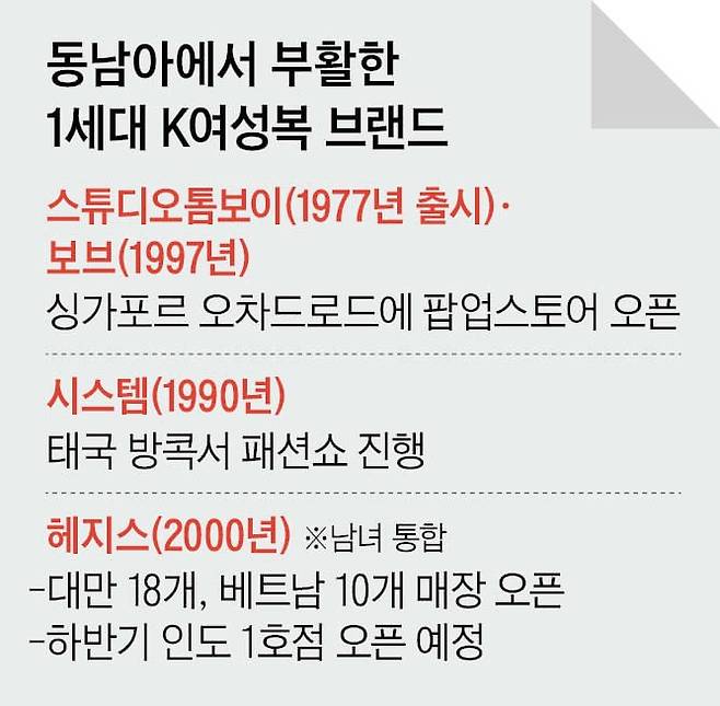 1세대 국내 토종 여성복 브랜드들이 경제 규모가 커지고 있는 동남아에서 ‘제2의 전성기’를 맞고 있다. 1977년 첫 출시된 48년 역사의 여성복 브랜드 ‘스튜디오톰보이’는 싱가포르 대표 쇼핑 거리 오차드로드에서 이달 5일까지 대형 팝업 스토어를 연다. 1990년생 여성복 브랜드 시스템은 지난달 태국에서 패션쇼를 진행했고, 현지 매장 출점도 추진 중이다. 내수 침체와 중저가·신생 브랜드들의 잇단 출현으로 경쟁이 치열해진 국내시장을 넘어 동남아에서 새로운 활로를 찾고 있는 것이다.