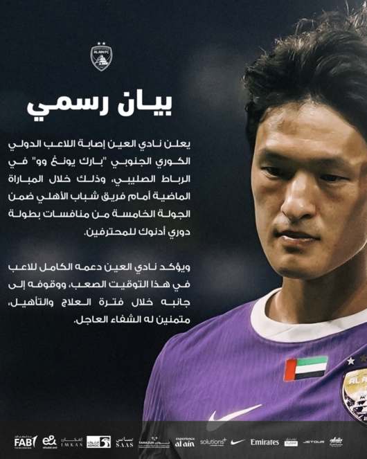 박용우의 소속팀 알 아인은 30일 공식 SNS를 통해 “한국국가대표 박용우가 지난 경기서 무릎에 심각한 인대손상을 입었다. 알 아인 구단은 힘든 시기를 보내고 있는 선수의 치료와 재활을 위해 최선의 지원을 다할 것이다. 박용우가 빨리 회복되길 기도한다”고 공식 발표했다.