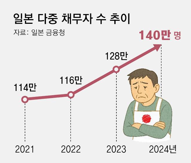 특히 자영업자와 소상공인이 상당수 포함된 것으로 알려진 가계의 ‘부채 버블’이 점차 커지면서 일본 경제와 사회에 큰 부담으로 작용할 것이란 우려가 불거져 나오고 있다. 도쿄신문은 올 5월 “코로나19 유행을 계기로 증가한 개인 대출이 2022년 이후 32개월 연속 증가하고 있다”고 전했다. 일본 대금업협회에 따르면 일본의 평균 가계부채는 655만 엔(약 6100만 원·2023년 기준)으로, 평균 연봉인 459만5000엔(약 4300만 원)을 훌쩍 웃돈다. 여기에 고물가, 저임금, 고금리의 ‘삼중고’가 이어지며 채무자들의 상환 부담이 커지고 있다. 일본에선 “정부가 보다 적극적으로 채무자와 파산 증가 관련 대책 마련에 나서야 한다”는 지적이 나온다.