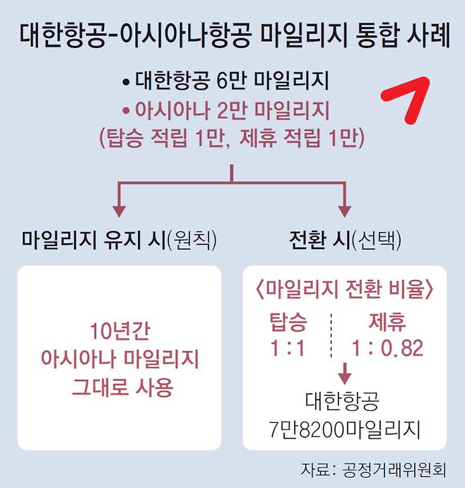 아시아나 마일리지를 대한항공 마일리지로 전환할 경우 소비자가 항공편을 구매·탑승해 적립한 마일리지는 1:1(대한항공:아시아나)로 전환된다. 신용카드 등 항공사 제휴를 통해 적립한 마일리지에는 1:0.82의 비율이 적용된다. 예를 들어 대한항공 6만 마일리지와 아시아나 2만 마일리지(탑승 1만, 제휴 1만 마일리지)를 보유한 고객이 마일리지를 전환할 경우 대한항공 총 7만8200마일리지를 갖게 된다.