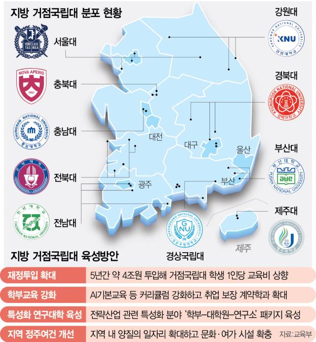 이를 위해 교육부는 일단 거점국립대에 2030년까지 5년간 추가로 총 4조원 이상을 투자해 학생 1인당 교육비를 서울대 수준(연간 약 6000만원)까지 이르게 할 계획이다. 현재 거점국립대 학생의 평균 1인당 교육비는 서울대의 40% 수준이다. 교육부는 재정 마련을 위해 올해 말 종료되는 고등·평생교육지원특별회계(고특)를 5년 연장하고, 교육세 개편 방안과 연계해 재원 규모를 단계적으로 확대하기로 했다.