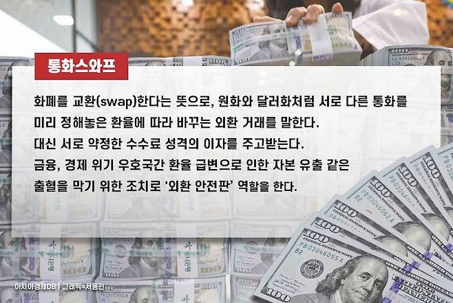 3500억달러를 3년 안에 전액 현금으로 투자하라는 미국의 비현실적인 요구에 우리 정부가 '무제한 통화스와프' 체결을 역제안했다. 미국과의 무제한 통화스와프 체결은 확실한 '달러 우산' 아래 들어가는 것이지만, 미국이 그 우산을 아무에나 내주지 않는다. 기축통화국에만 통화스와프를 제공한다는 원칙 아래 유럽연합(EU), 영국, 스위스, 캐나다 그리고 아시아에서는 일본만이 그 우산 아래 들어가 있다. 한국은 비기축통화국으로 아직 그 반열에 올라 있지 않다. 글로벌 무역결제에서 원화 거래 비중도 1% 미만으로 미미해 통화스와프 체결에 따른 실익이 매우 낮다는 게 미국의 입장이다.