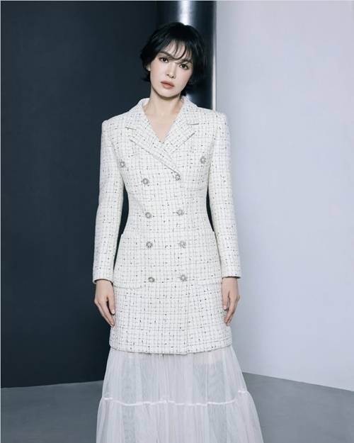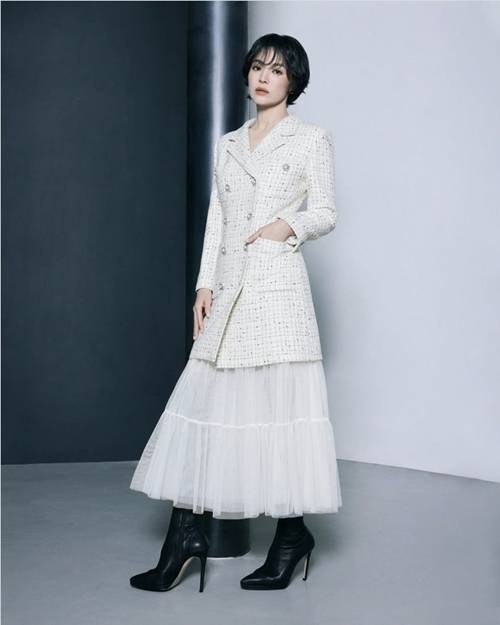 10월 1일 공개된 화보에서 송혜교는 화이트 트위드 롱 자켓과 시스루 맥시 스커트를 매치해 단아하면서도 세련된 무드를 완성했다. 고급스러운 소재와 절제된 실루엣이 조화를 이루며 ‘가을 여신’의 정석을 보여줬다.