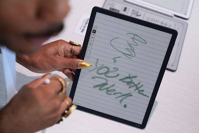 [뉴욕=AP/뉴시스] 지난달 30일(현지 시간) 미국 뉴욕에서 열린 아마존 신제품 발표 행사장에서 방문객들이 전자책 리더기 '킨들 스크라이브 컬러소프트'를 체험하고 있다. 이 제품은 '킨들 스크라이브'에 컬러 필기와 인공지능(AI) 기능 등이 추가됐다. 아마존은 이날 '킨들'을 비롯해 차세대 스피커 '에코'(Echo)와 스마트 홈 보안 카메라 '링'(Ring) 등을 공개했다. 2025.10.01.