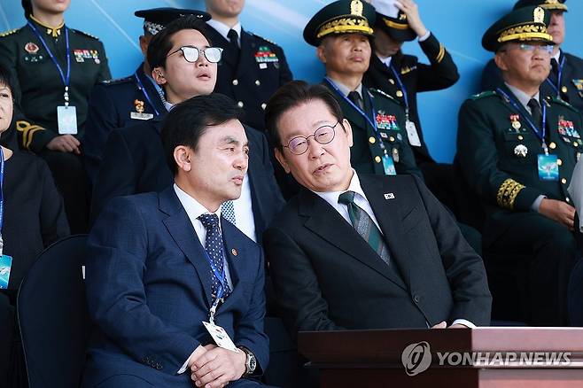 (계룡=연합뉴스) 김도훈 기자 = 이재명 대통령이 1일 충남 계룡대 대연병장에서 열린 건군 77주년 국군의 날 기념행사에서 안규백 국방부 장관과 대화하고 있다. 2025.10.1
