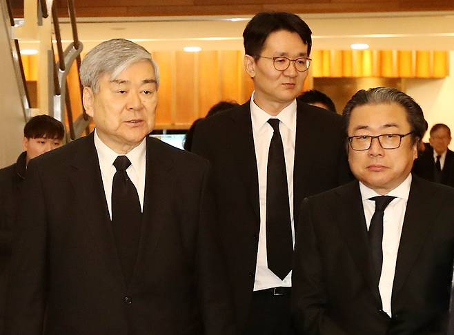 | ▲ 2016년 12월 16일, 조양호 한진그룹 당시 회장(왼쪽부터), 조원태 대한항공 대표이사, 조정호 메리츠금융지주 회장이 서울 서대문구 연세대세브란스병원 장례식장에서 고 조중훈 한진그룹 창업주의 부인이자 조 회장의 모친인 김정일 여사의 입관식을 위해 빈소를 떠나고 있다. |